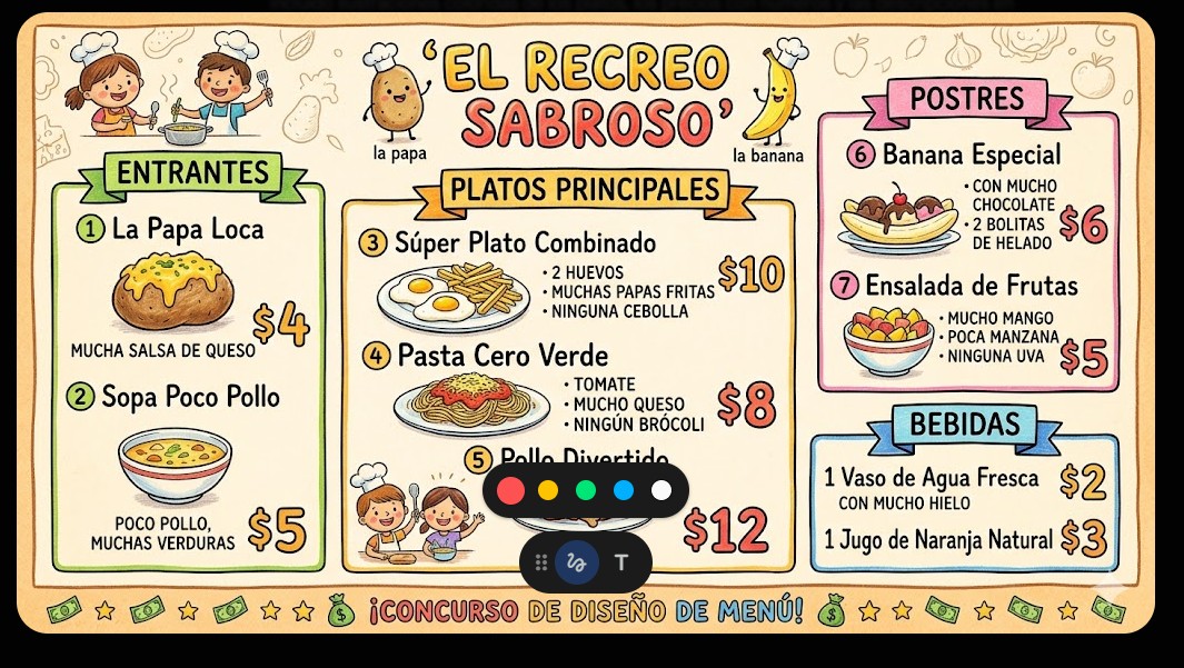 Menu by mělo být barevné a hezky ilustrované. Ve třídě pak vybereme jeden vítězný design, který se stane naším oficiálním menu!