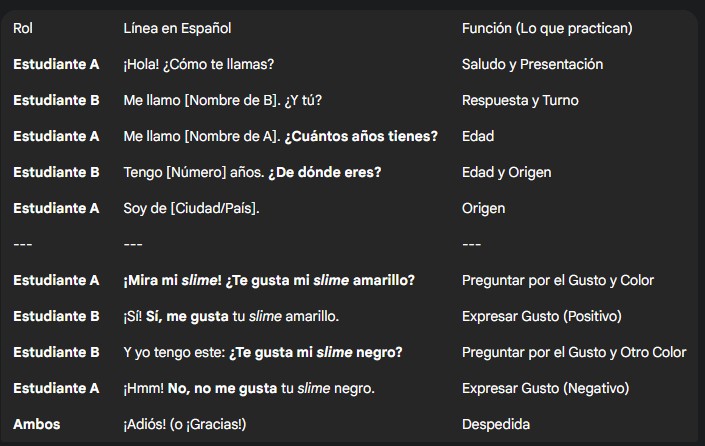 Komunikace: Každé dítě ve dvojici představí svůj barevný sliz a procvičí si konverzaci s otázkou: "¿Te gusta mi slime [BARVA]?" (Líbí se ti můj [BARVA] sliz?)