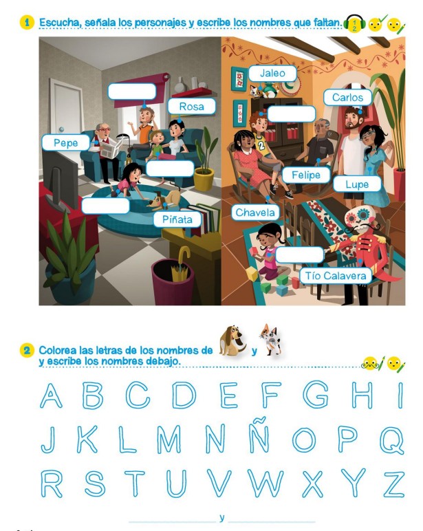 Nová Slovní Zásoba Hláskování, Mluvení Aktivní procvičování a hláskování nových slov. U každého slova určujeme, zda je to ¿Quién (např. abuela) nebo ¿Qué (např. jABLKO).